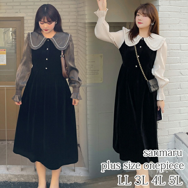 大きいサイズ ワンピース ブラックジャンパースカート パールフラワーボタン ホワイトレースブラウス ビッグカラー